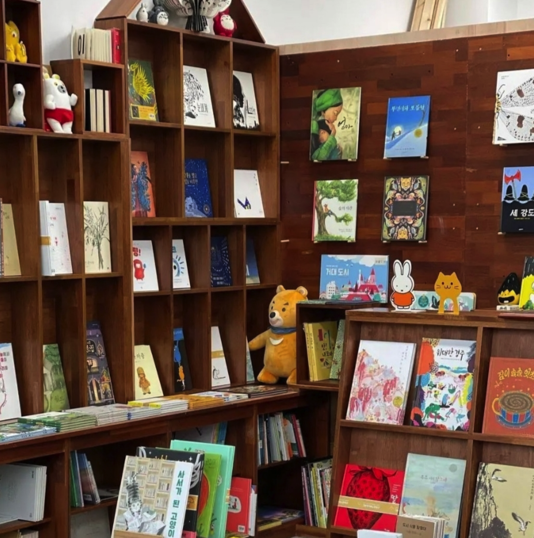 밑에 책장에 다양한 그림책들과 함께 노란돼지, 달그림 그림책들도 여기저기 예쁘게 진열되어 있네요. 더욱더 반가운 책들! 보이시나요? 제가 마케터이다 보니 우리 책부터 찾게 되는 건 어쩔 수 없다고요! 《연남천 풀다발》 《무무 씨의 달그네》 《엄청난 눈》 《알바트로스의 꿈》 《빛을 찾아서》 《차갑고 뜨거운 이야기》, 여러분들도 모두 찾으셨나요?