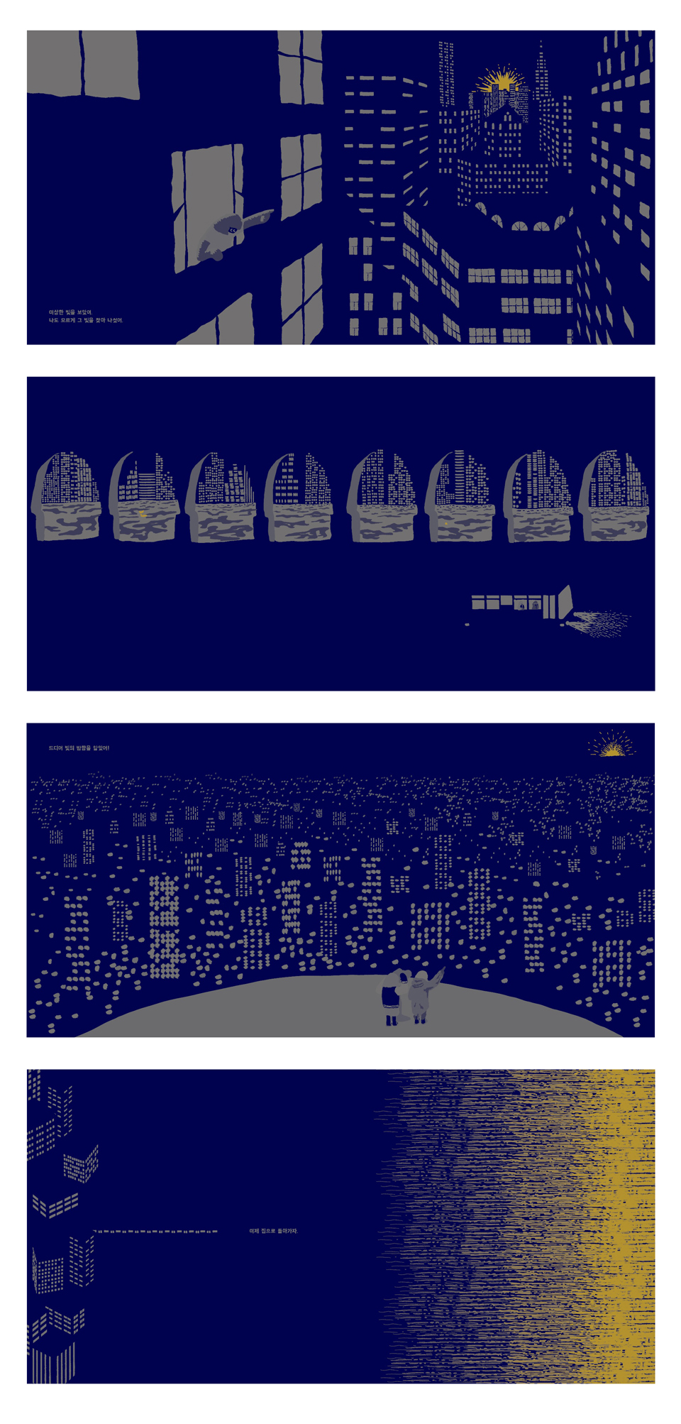 친구네 집까지 첫 외출에 나선 아이는 풍선을 따라가며 동네 곳곳을 모험하게 되지요. 그리고 친구네 집으로 가는 길 위에서 다양한 사람과 동물과 사물을 만나게 됩니다. 날이 어둑어둑해진 뒤 다시 집으로 돌아가기 위해 친구네 집을 나서지요. 그때부터 골목길의 새로운 세계가 펼쳐집니다. 짙은 어둠이 내려진 골목길은 알록달록했던 낮 풍경과는 다르게 그림자와 실루엣만으로 아주 근사한 상상의 공간을 만들어 냅니다. 이제부터 주인공 아이의 진짜 혼자만의 마법 같은 시간이 펼쳐지지요.