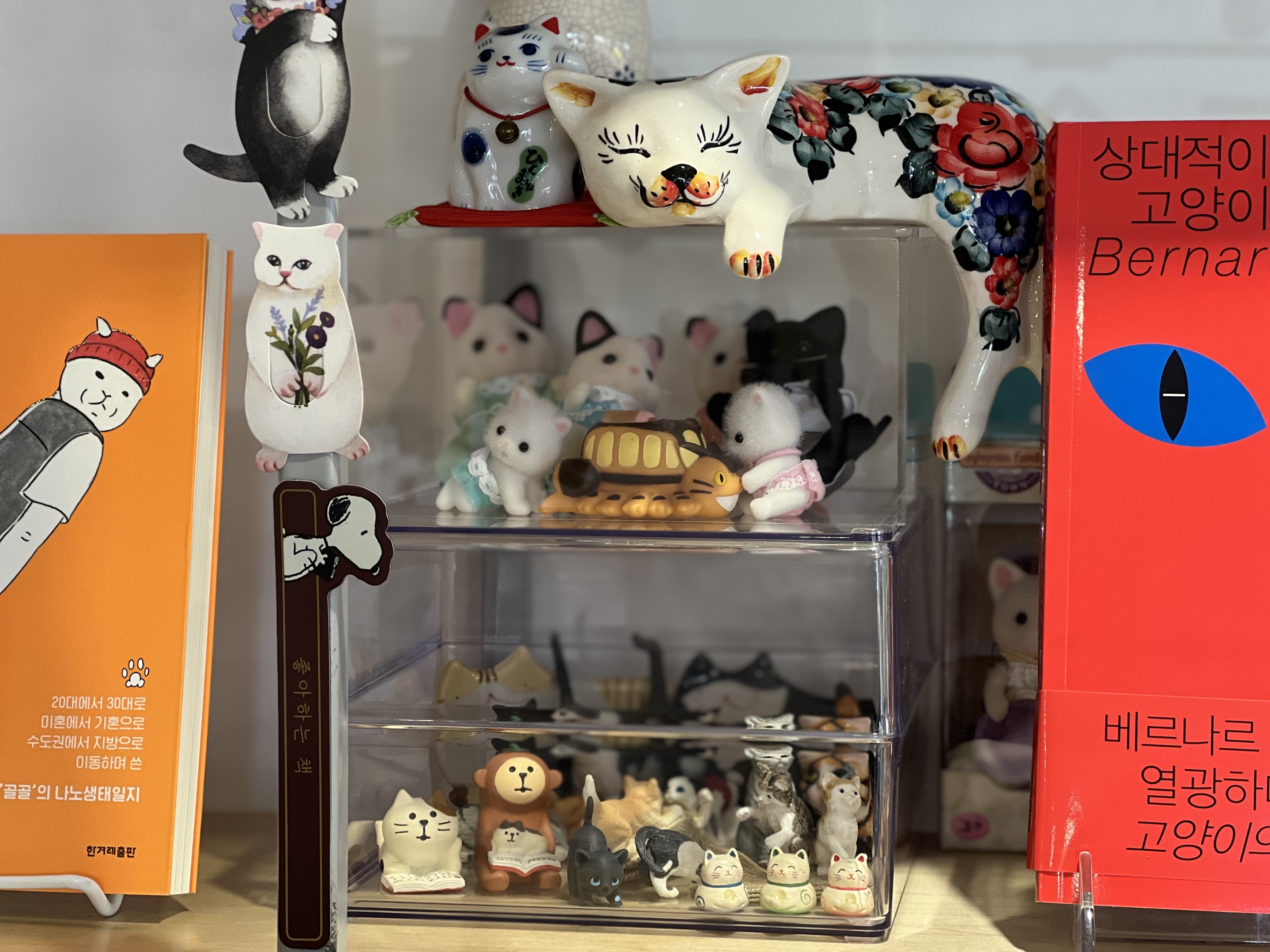 이 책방의 가장 큰 특징은 책에서 방금 튀어나온 듯한 캐릭터들이 같이 전시되어 있다는 점 입니다. 책과 더불어 구경하는 재미가 쏠쏠합니다. 또한 고양이를 사랑하는 책방지기의 마음이 듬뿍 느껴지는 공간이기도 합니다. 아기자기한 고양이 소품들이 굉장히 많거든요! 따뜻하고 아늑한 곳에서 좋아하는 책, 고양이들, 캐릭터들을 구경하며 커피 한 잔. 이 얼마나 행복한 공간인지요. 전시와 북토크 등 다양한 행사도 자주 한다고 하니 꼭 한 번 가보시길 추천드립니다.