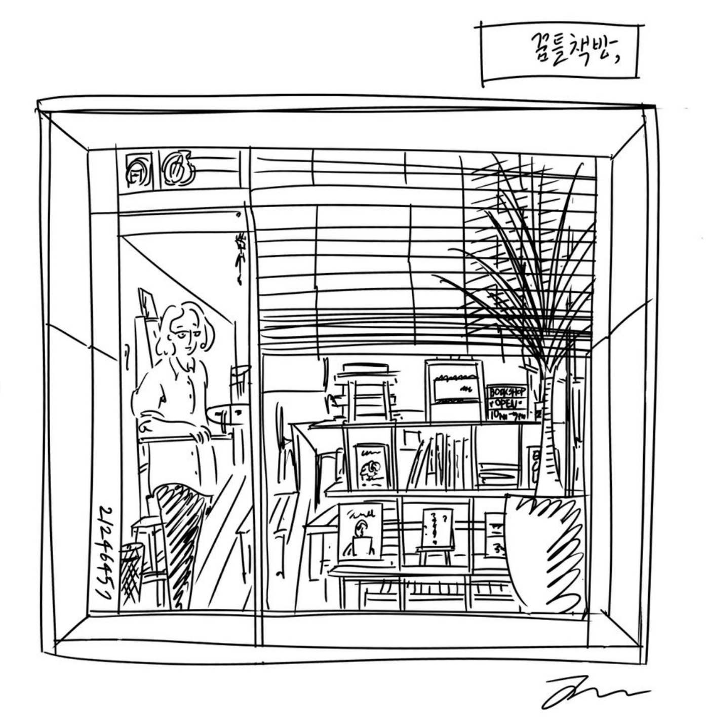 오늘 제가 소개할 책방은 김포 최초의 동네서점이면서 느린 가치를 공유하는 곳 '꿈틀책방'입니다. 김포 원도심 주택가 골목에 위치하고 있죠. 《경계선》의 장선우, 장서윤 작가님의 단골 책방이기도 한데요. 장서윤 작가님께서 21년도에 꿈틀책방의 모습을 보고 그리신 그림과 장선우 작가님의 책방 소개 글도 가져와 봤습니다.